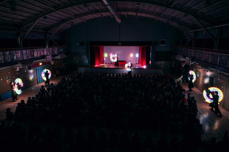 当日は体育館に全校生徒の皆さん、先生方、PTAの皆様が集まり、会場全体が一体となってショーを楽しんでいただきました。